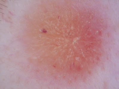 Solar K Also look for 4 dots in the middle of a white circle in actinic keratoses. These are also known as rosettes. Dot vesels are also seen here.